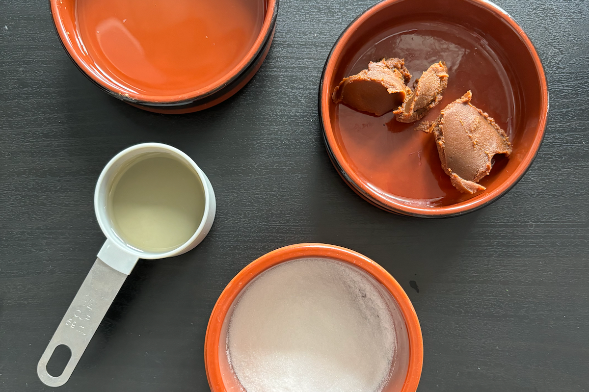 Boil ¼ cup of sake and ¼ cup of mirin together to evaporate the alcohol, before turning down the heat and adding ¼ cup white miso paste and 3 tablespoons of granulated sugar. Mix together.