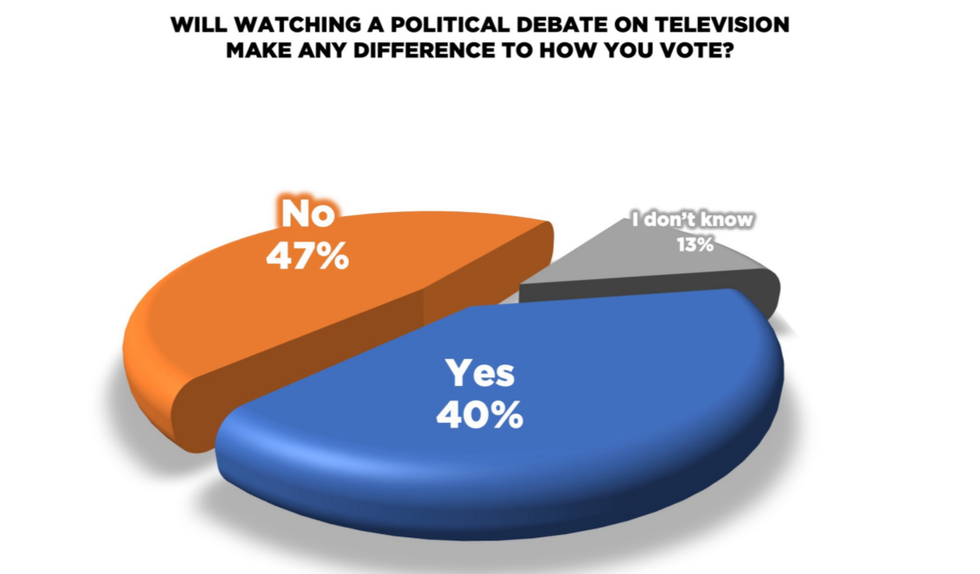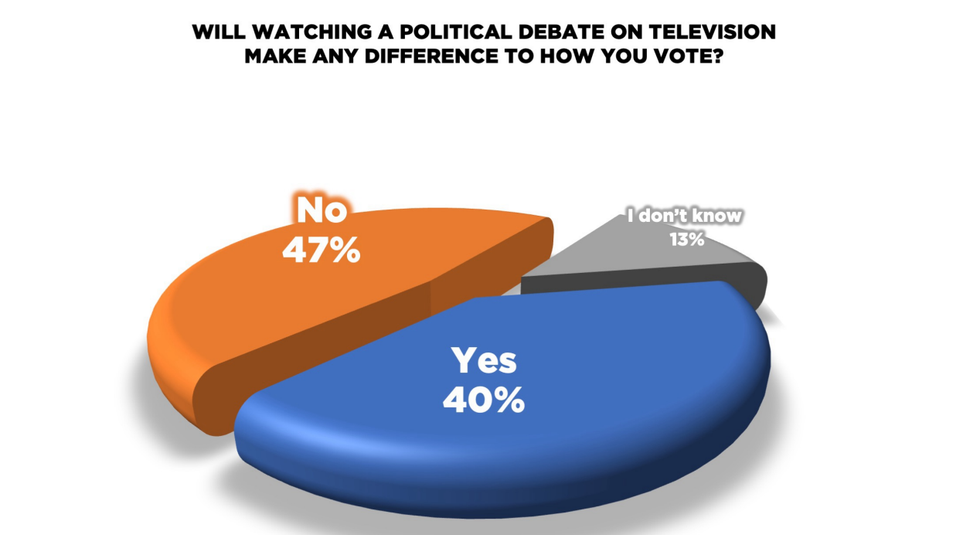 When asked whether watching a political debate on television would make any difference on how they voted, 47 per cent said it wouldn't, 40 per cent said it would and 13 per cent said they didn't know.
